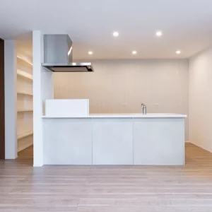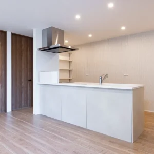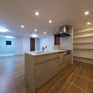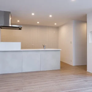 室内に足を踏み入れると、優しい木目のフローリングと、アイボリーを基調とした内装が出迎えてくれます。LDKはひと続きの開放的な空間でありながら、照明の配置や天井高の工夫によって、リビング・ダイニング・キッチンがそれぞれの居場所として心地よく機能しています。中央には大きなアイランドキッチンが設置されており、料理をする人と食事をする人、そしてくつろぐ人が自然にコミュニケーションを取れるようになっています。