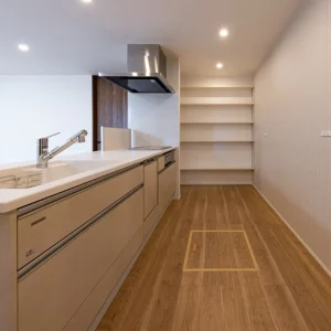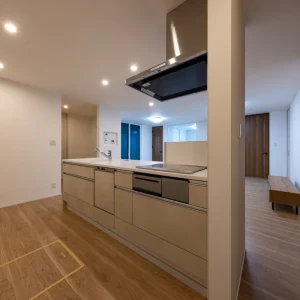 リビングまで見渡せる開放的なレイアウトが印象的なキッチン