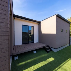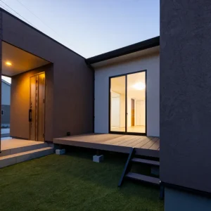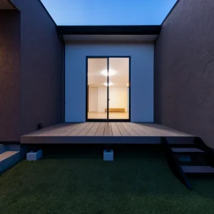 建物の中心に向かって開かれたレイアウトは、外部からの視線を自然に遮りながら、内側には開放的な空間を確保する設計となっています。中央部分にはウッドデッキが設けられており、晴れた日には家族で朝食をとったり、夜には柔らかな灯りの中でゆったりとした時間を過ごしたりと、多目的に利用できる屋外空間として重宝します。