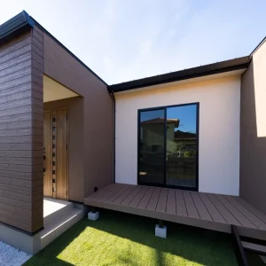 玄関とウッドデッキが隣接したコの字型の住まい