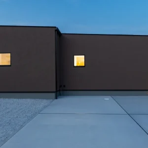 まず印象的なのは、外観の美しい塗り壁仕上げです。コテ跡をあえて残したテクスチャーが、光の加減で表情を変え、日中はやさしく、夜にはしっとりとした陰影を演出します。