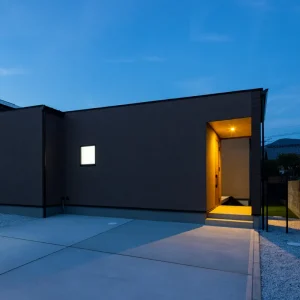 夕暮れ時、玄関と中庭を包むように照らす外灯のあかりが印象的な一枚