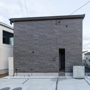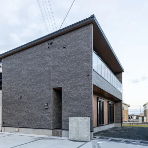 外観はダークトーンの外壁材を基調に、直線的なラインと面構成でまとめることで、周囲の住宅街の中でも凛とした存在感を放ちます。