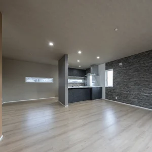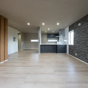 キッチンとリビングがひと続きになった広々としたLDK。床材と壁の色味を揃え、統一感のある空間に仕上げています。