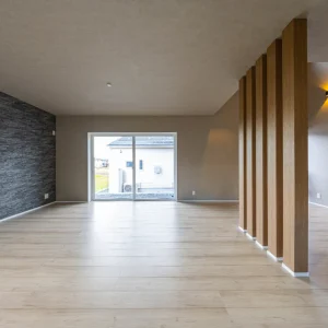 リビング中央に設けた木製の縦格子が空間をやわらかく仕切るデザイン。視線を遮りすぎず、ほどよい区切りをつくっています。