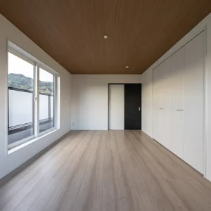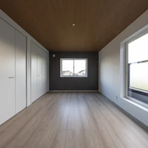 木目調の天井と明るい床材が調和した洋室。壁一面のクローゼットで収納力も確保した、すっきりとした空間です。