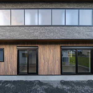 また、1階部分には木目調の外壁材を取り入れ、無機質になりがちな外観にあたたかみを添えています。上下階で素材感を切り替えることで、建物全体にほどよいリズムと奥行きが生まれました。