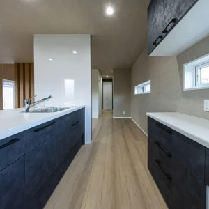 ダークカラーのキッチンと白い天板が印象的なキッチン。背面収納と作業スペースをしっかり確保した、使い勝手のよいレイアウトです。