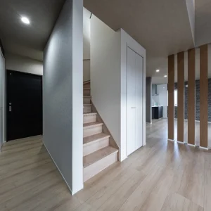 玄関ホールから階段、LDKへと続く動線。白とグレーを基調にした落ち着いた空間に、木のアクセントがやさしく映えます。