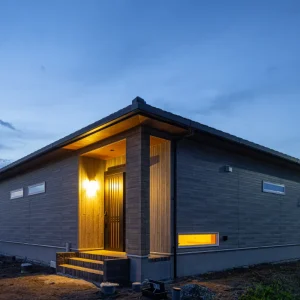 玄関ポーチにあたたかな灯りがともる夕暮れの外観。木目の軒天と落ち着いた外壁が、やさしい雰囲気をつくっています。