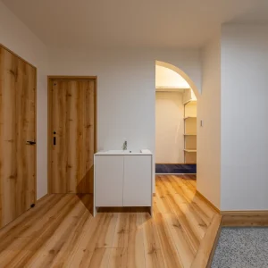 玄関に足を踏み入れると、まず目に入るのは木の風合いを活かした建具と、やわらかな印象を与えるアーチ形の開口。直線だけで構成せず、曲線を取り入れることで、空間にほどよい遊び心とやさしさを添えています。