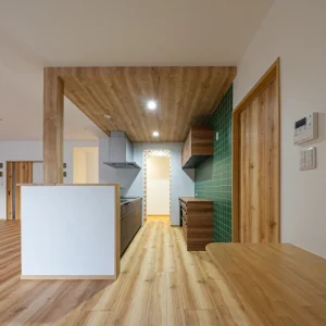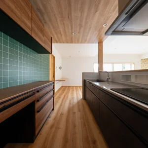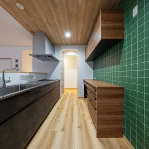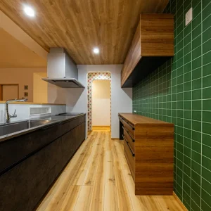 木目天井とグリーンタイルの組み合わせが目を引くキッチン。奥のアーチ開口が空間にやさしいリズムを加えています。
