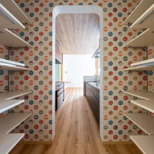 背面収納は、作業台としても活用できる十分な奥行きを確保。調理家電や食器をすっきりと収められるため、生活感を抑えた美しい空間を保てます。また、キッチン奥にはアーチ形の開口でつながるパントリーを配置。やわらかな曲線とカラフルなクロスが空間のアクセントとなり、実用性とデザイン性を兼ね備えた動線計画が実現しました。