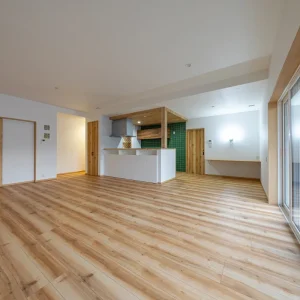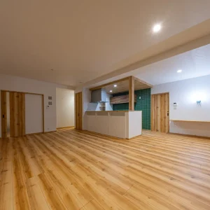 木目の床が広がる開放的なLDK。キッチンを中心に空間がゆるやかにつながり、家族が自然と集まる間取りです。