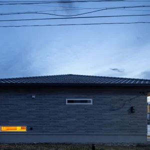 横長のスリット窓が印象的な外観側面。室内の明かりが外ににじみ、夜の街並みに自然と溶け込む佇まいです。