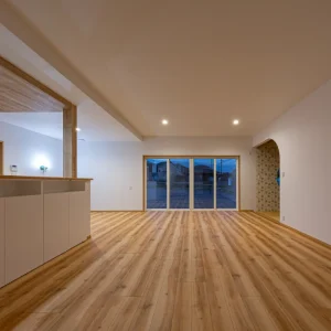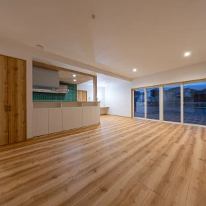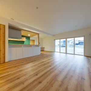 キッチン・ダイニング・リビングを一体的につなげたLDKは、どこにいても開放感を感じられる空間。大きな掃き出し窓から差し込む自然光が、床や天井の木の質感をやさしく引き立て、時間帯によって表情の変化も楽しめます。キッチンを中心に視線が抜けるレイアウトとすることで、家族の気配を感じながらそれぞれが心地よく過ごせる設計に。空間を区切りすぎず、つながりを大切にしたLDKが、日常にゆとりと心地よさをもたらします。
