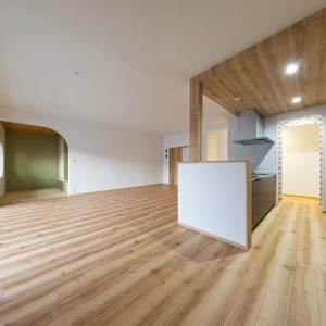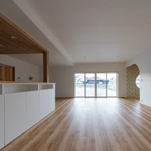 キッチン側から見たリビングと和室スペース。アーチ開口が空間のアクセントになっています。