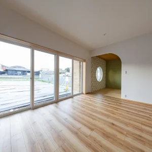 LDKに隣接した和室は、空間にやさしい緩衝帯をつくる存在。アーチ状の開口が視線と動線をやわらかくつなぎ、洋の空間から自然と気持ちを切り替えられる場所です。丸窓から差し込む光や外の気配が、室内に静かな表情をプラス。畳の落ち着きと木の質感が重なり合い、くつろぎの時間はもちろん、来客時やお子さまの遊び場としても柔軟に使える一室です。