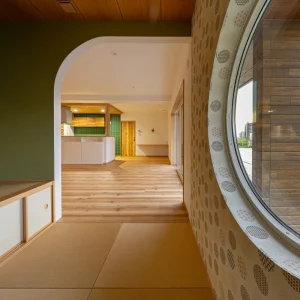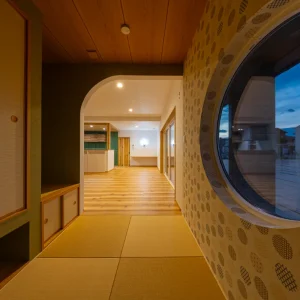 丸窓からやわらかな光が入る和室。畳と木天井がつくる落ち着いた空間から、LDKまで視線が抜ける開放的なつながりが魅力です。