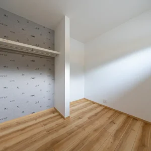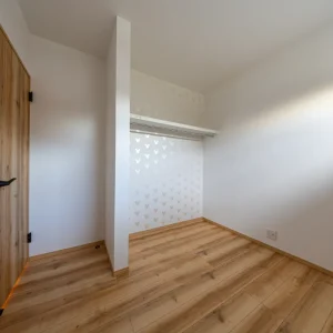 収納スペースを備えた洋室。木目の床と白い壁でまとめた、シンプルで使いやすい空間です。