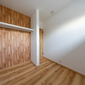 木目調クロスが印象的な収納付き洋室。落ち着いた色合いで、寝室や子ども部屋など幅広く使えます。