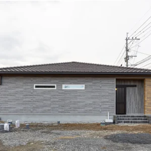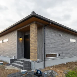落ち着いたグレートーンの外壁を基調に、木目のアクセントを随所に取り入れた外観デザイン。水平ラインを意識した端正なフォルムが、平屋ならではの安定感と伸びやかさを際立たせています。