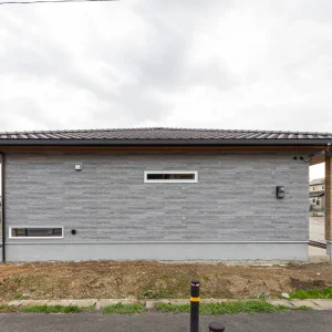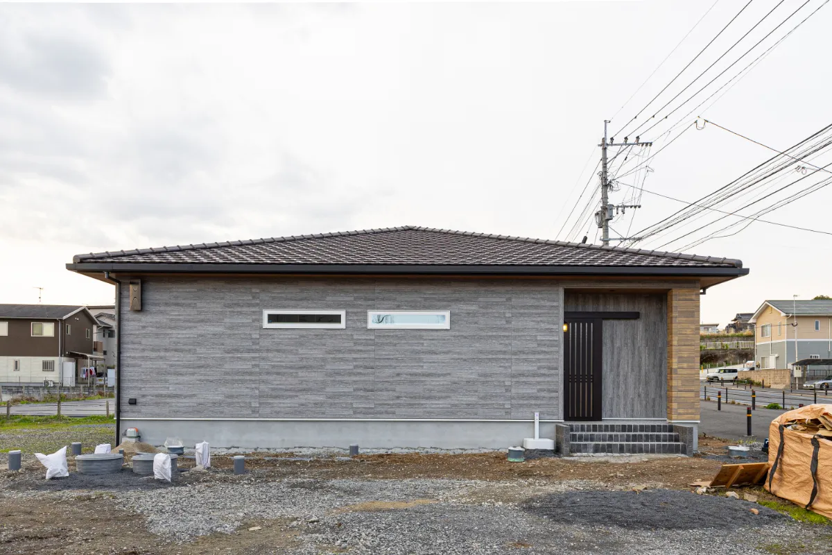 素材感とプロポーションのバランスにこだわった外観は、街並みに自然と溶け込みながらも、ふと目を引く存在感を放つ仕上がりに。これから始まる暮らしへの期待を、静かに高めてくれる平屋住宅です。