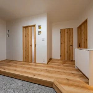 木目の床と白い壁でまとめた明るい玄関ホール。段差を設けた上がり框が空間にメリハリをつくり、奥行きを感じさせます。