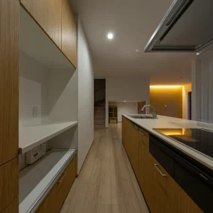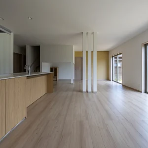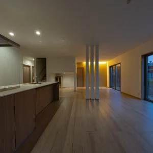 空間の中央には、細身の柱をリズムよく配置。完全に仕切るのではなく、視線や動線をゆるやかに区切ることで、リビング・ダイニング・キッチンそれぞれの居場所を確保しながら、一体感のある空間構成を実現しています。どこにいても家族の気配が自然と伝わり、思い思いの過ごし方を受け止めてくれる懐の深さが魅力です。