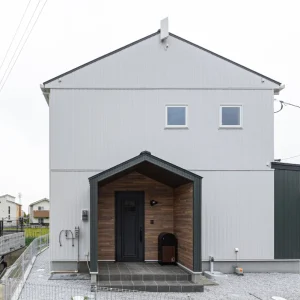 玄関まわりには木目調の外壁を取り入れ、無機質になりがちな外観にやわらかな表情をプラス。奥まったポーチ形状とすることで、外からの視線をやさしく遮りつつ、住まいに入る前のワンクッションとなる落ち着いたアプローチ空間をつくり出しています。