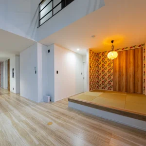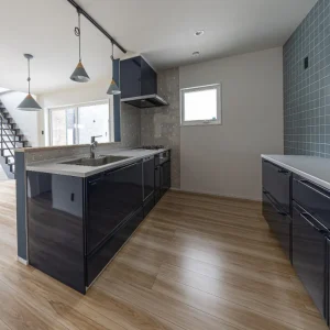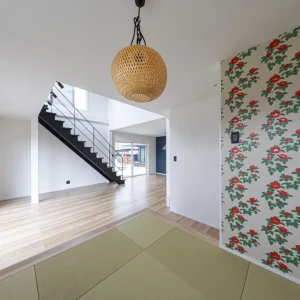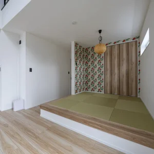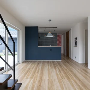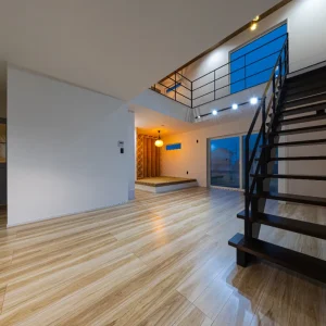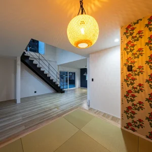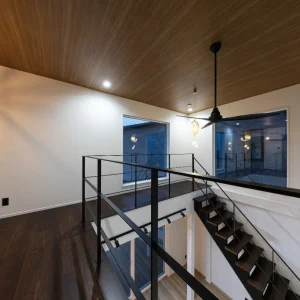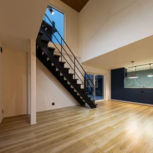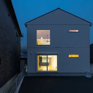 夕景では、室内からこぼれるあたたかな灯りが、静かな外観に表情を与え、昼とは異なる印象に。外からは落ち着いた佇まいを保ちながら、その内側には“遊び心”と心地よさを秘めた住まいであることを、さりげなく感じさせる外観デザインとなりました。
