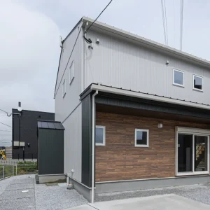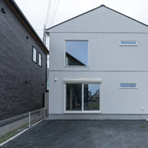 外観は、淡いグレートーンの外壁をベースに、直線的で無駄のないフォルムにまとめた二階建て住宅。切妻屋根のシンプルなシルエットが、周囲の街並みにすっと馴染みながらも、凛とした存在感を放ちます。装飾を抑えた外観だからこそ、建物そのもののプロポーションの美しさが際立つ佇まいです。